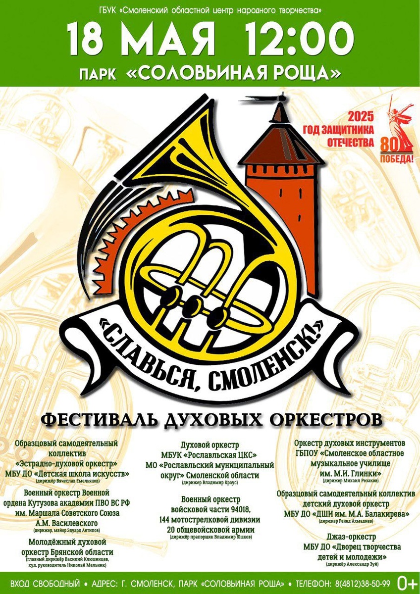 🤗18 мая в 12:00 приглашаем в Соловьиную рощу на фестиваль духовых оркестров «Славься, Смоленск!», приуроченный к 80-летию Великой Победы и Году защитника Отечества.