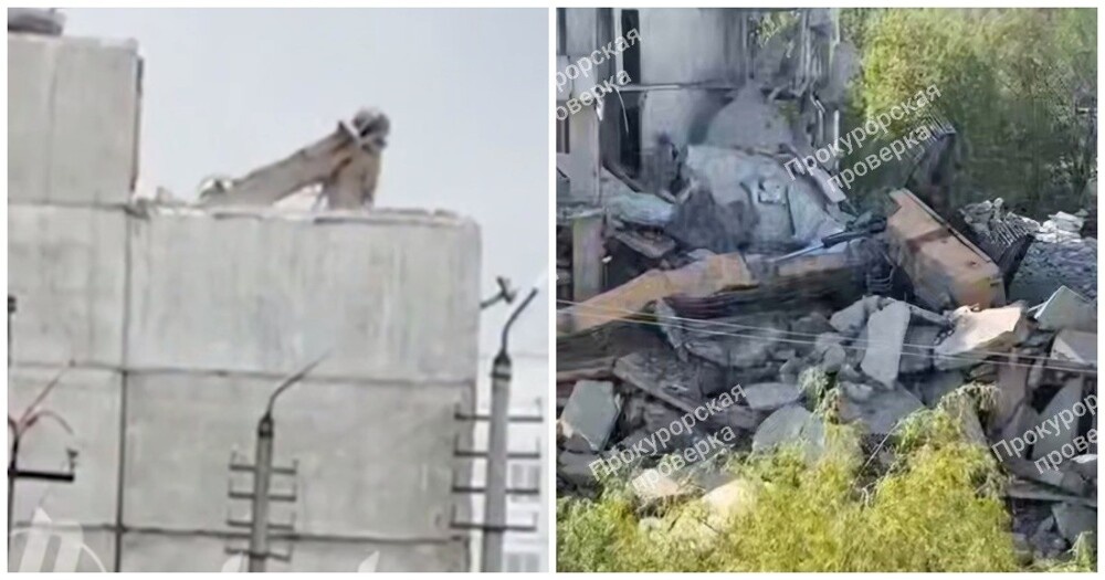 В городе Липки Тульской области произошёл несчастный случай, но участники инцидента, судя по всему, так не считают. Участвовавший в демонтаже пятиэтажки экскаватор рухнул с высоты четвёртого этажа, а затем, когда его перевернули, вновь продолжил работу. Ни машина, ни экскаваторщик не пострадали.