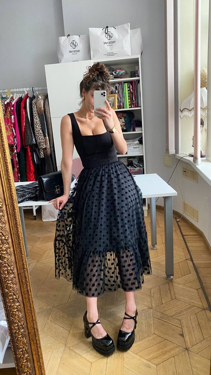 Передаем пламенный привет из офиса, и напоминаем, что у нас на сейле не только юбки из экокожи, но и наши потрясающие юбки-пачки из органзы в бархатную мушку, цена - подарок 💝 в этом образе мы скомбинировали ее с корсажем из костюмной ткани