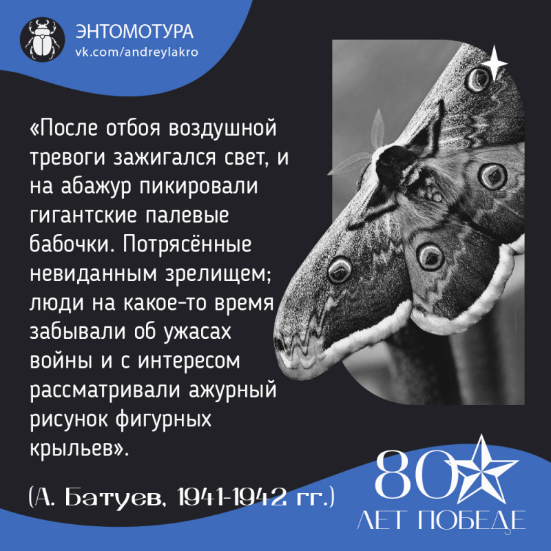Указом президента текущий год посвящён защитникам отечества, а на этой неделе страна отметит 80-летие со дня Победы. Сложно не заметить, сколько уже появилось тематических материалов, не буду в стороне. Самое время вспомнить, что героизм – это не только страшные жертвы и тысячи поверженных врагов. Иногда подвиг может показаться мелочью, как ползущая по травинке букашка. Но эта мелочь подчиняется эффекту бабочки, спасая жизни и оставляя след в истории. Кстати о бабочках… Бабочки История о бабочках в блокадном Ленинграде уже классика. Это эпизод из жизни удивительного человека, педагога, писателя, мастера спорта и певца Андрея Батуева. Как признавал сам автор, в его жизни было три страсти: животный мир, шахматы и пение. Увлекаясь сам, он увлекал детей: вера Батуева в добро спасала малолетних преступников, на которых остальное общество уже поставило крест. Перед блокадой к Батуеву попала кладка павлиноглазок. При союзах в качестве эксперимента бабочек разводили для получения шёлка. Несмот