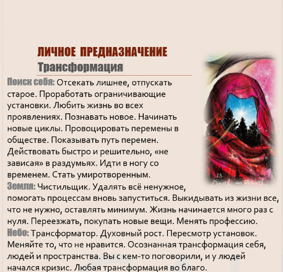 Энергия изменений и риска, освобождения и трансформаций. Одним своим присутствием меняет жизни людей. В жизни нет ничего постоянного, и что это прекрасно. Не бояться перемен, извлекать уроки и закалять внутренний стержень. Избегать пессимизма и зацикленности на прошлом. Содержать дом и мысли в чистоте. Не отказывать обратившимся к вам за помощью. Отсекать лишнее, отпускать старое. Со спокойной душой оставлять в прошлом то, что отжило себя (отношения, хобби). Проработать ограничивающие установки. Любить жизнь во всех проявлениях. Познавать новое, достигать, начинать новые циклы в своей судьбе. Изменить мир к лучшему, постоянно адаптируясь и изменяясь, уча этому других людей и давая инструменты. Провоцировать перемены в обществе. Показывать путь перемен. Помогать не бояться их. Действовать быстро и решительно, «не зависая» в раздумьях. Сделать свою реальность яркой. Идти в ногу со временем. Стать спокойным, умиротворенным, избавиться от суеты, резкости, агрессивности, безбашенности и безрассудства. Не рисковать жизнью напрасно. Медитировать, заниматься йогой, статическими упражнениями, это сбалансирует вашу неуемную энергию. Также одна из ваших задач понять философию жизни и смерти, перестать бояться за здоровье родных и близких.