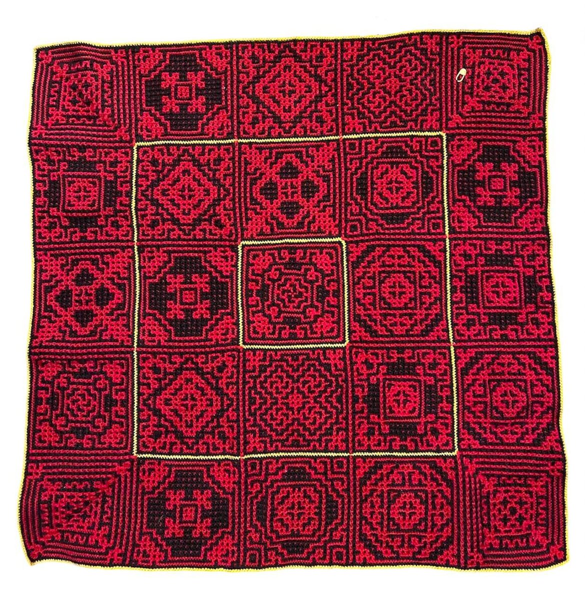 В проекте «Китай» экспериментируем: берем квадратные мотивы, имитируем с ними пэчворк — вяжем из центра полотно. Играем с черным, алым и золотом.