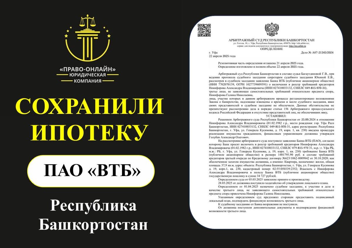 🏠 Квартира сохранена — кредиты обнулены! Суд уже утвердил решение, клиент спит спокойно. 📌 Суть дела Жильё: единственная ипотека (квартира 37,9 м², Уфа). Долги: несколько потреб-кредитов + просрочки. Наш ход: подготовили индивидуальный план → суд оставил ипотеку в прежнем графике, а все остальные долги спишутся в банкротстве. 🏦 Кому клиент был должен • ПАО Сбербанк • ПАО Совкомбанк • ПАО ВТБ – ипотека 1 481 795 ₽ (платёж остаётся без изменений) 🛡 Что мы сделали ✔ Убедили суд: жильё остаётся, долг списывается. ✔ Заморозили исполнительные производства — коллекторы «замолчали». ✔ Защитили доходы и счета — полный финансовый щит. 🏁 Итог После завершения процедуры клиент платит только по ипотеке. Всё остальное — ноль. Квартира, доход и нервные клетки сохранены. 💬 Хотите также? Напишите в личку ИПОТЕКА — бесплатно разберём вашу ситуацию и покажем, как списать долги без потери дома. 🤝 Бонус за рекомендацию Привели человека, которому мы реально помогли — получаете 10 000–15 000 ₽.