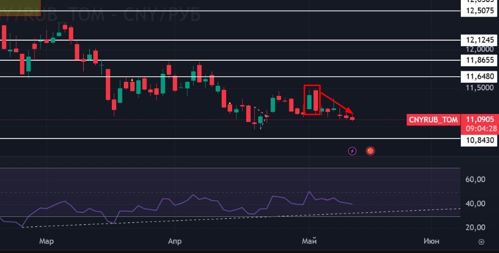 🟢5 мая нарисовали на дневке медвежье поглощение, и плавно сползаем вниз. Сегодня снижение снова меньше АТР - 0,21%, все хоронят юань. потому что он пробил локальные минимумы и оказался на уровне 22 апреля. Покупатель снов сегодня был в 10 утра, поработал до 11 и ушел, с тех пор, рубль продолжил по-немногу свое укрепление.