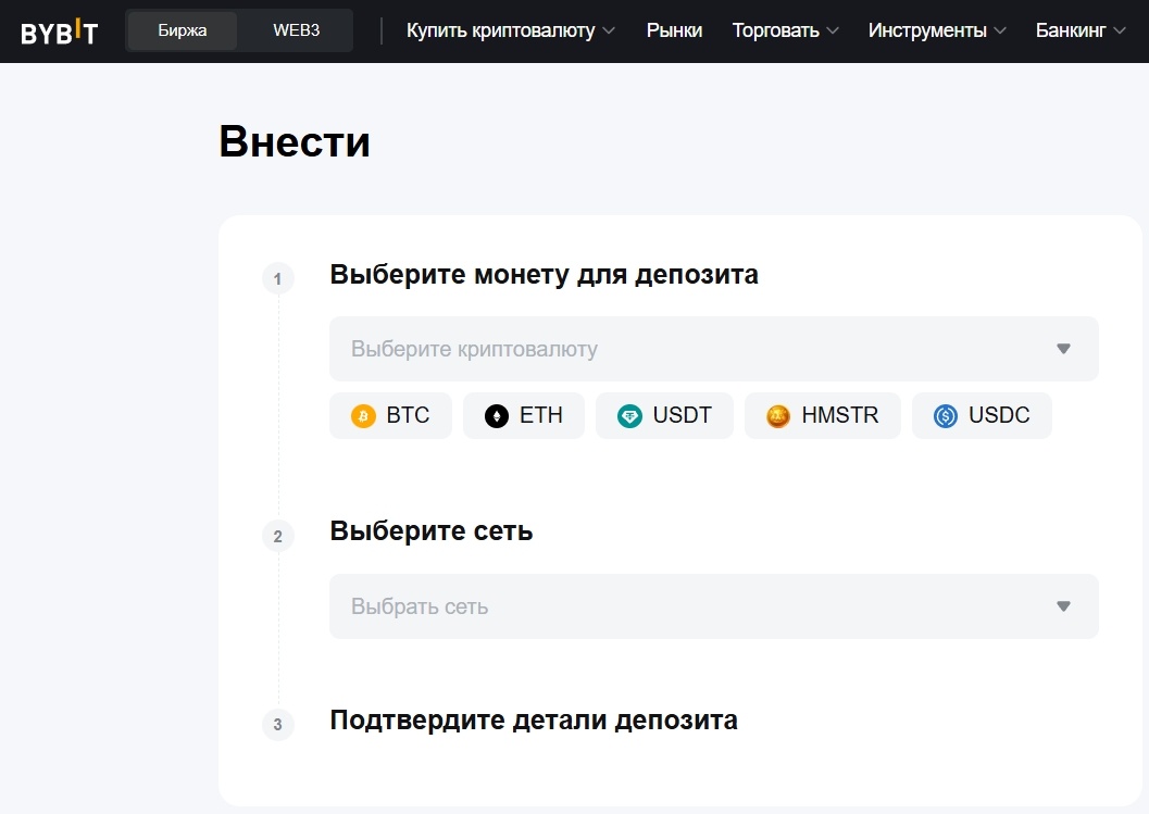 Внести средства в криптовалюте на Bybit