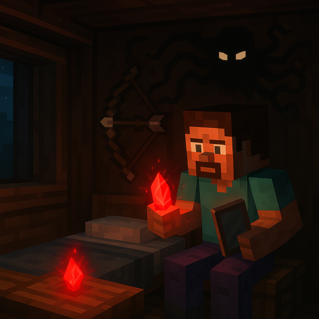 Глава 1: Зов осколка. Стив проснулся от жгучего холода в груди. Осколок Эфиротени на его столе пульсировал кровавым светом, а на стене хижины тень Нулла разрослась, обвиваясь вокруг лука и стрел. Стив схватил зеркало, но портал не открывался — вместо тумана в раме отражался перекошенный лес из первой встречи с Тенепрядами. Внезапно осколок впился ему в ладонь, оставив шрам в форме спирали. Боль была ключом: зеркало ожило, и Стив шагнул обратно в Эфиротень... но попал не туда, где был. Перед ним текла река-спираль, только теперь её воды были чёрными, а в небе висели три луны. Надпись на осколке засветилась: «Прошлое зовёт тех, кто смеет слушать». Глава 2: Лумины-призраки. Стив оказался в мёртвой копии деревни Луминов. Дома-пузыри лопнули, а сами Лумины стали полупрозрачными, словно призраки. Они не отвечали на крафт, а лишь указывали на трещину в земле, откуда лился фиолетовый дым. Спустившись в неё, Стив нашёл Храм Времени — здание, наполовину поглощённое чёрной слизью.