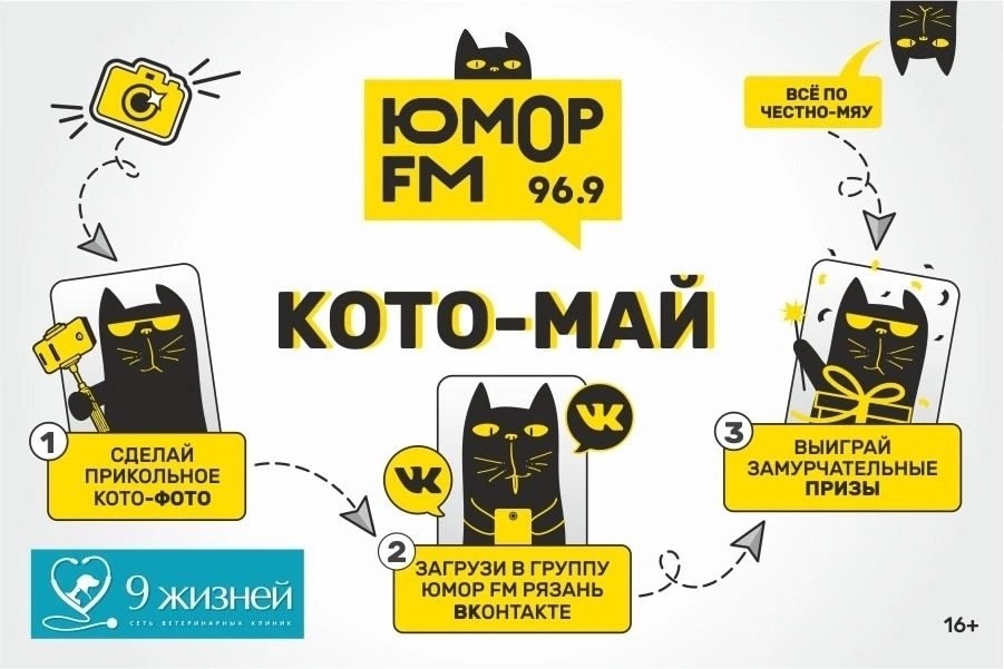 «Юмор FM» представляет: КОТО-МАЙ. Версия 5.0. «Юмор FM Рязань» снова объявляет фотобатл за звание «Самый смешной кот Рязани». Слушателям нужно показать своего пушистого комика, загрузив фото в альбом конкурса до 26 мая. 30 мая после голосования жюри радиостанция объявит победителя. Лучшие кадры также попадут в газету «Панорама города», а их авторы получат призы от «Юмор FM» и Сети ветеринарных клиник «9 жизней»: 2 сертификата номиналом 3000 рублей на любые ветеринарные услуги и огромную корзину корма для победителя. Партнер акции: Сеть ветеринарных клиник «9 жизней» http://9zhizney.ru/ Реклама. ИП Питецкая Е. С. Erid 2VtzqxdS2mi