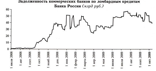Следует отметить, что главным результатом антикризисной денежно-кредитной политики в России стало поддержание на плаву банковской системы в целом. Однако предотвратить значительный спад производства, который продолжался по крайней мере до октября 2009 г., не удалось.