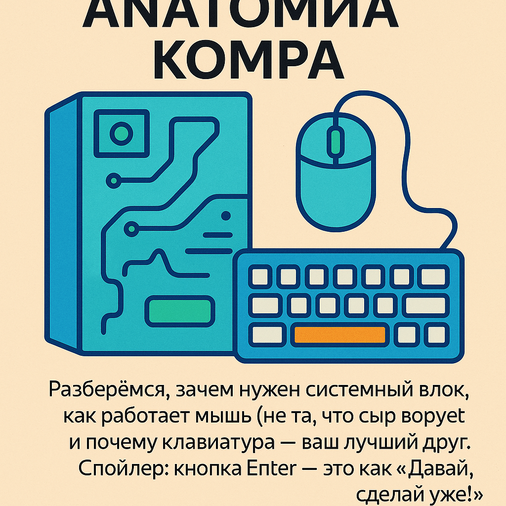 Вы когда-нибудь задумывались, из чего состоит компьютер и почему он делает то, что вы от него хотите (ну, почти всегда)? Давайте разберёмся, что за волшебство творится в этом загадочном ящике под столом — системном блоке — и почему клавиатура круче, чем кажется! Начнём с главного. Системный блок — это не просто коробка с вентиляторами. Это настоящий многофункциональный организм, в котором каждое устройство играет свою роль: Вентиляторы — это как кондиционеры. Без них компьютер перегреется и скажет вам: «Я пас». Да, раньше мыши действительно имели шарик внутри. Сегодня — это лазерное или оптическое устройство, которое считывает движение по поверхности и передаёт его в ПК. Мышь — это ваша виртуальная рука, которой вы управляете в цифровом мире. Это больше, чем просто набор кнопок. Это инструмент управления, общения, программирования и даже развлечений. Каждая клавиша — герой на своём месте. Даже те, что вы никогда не нажимали (ну да, Scroll Lock, я тебя вижу). Понимание «анатомии» компь