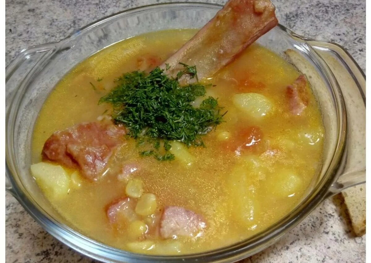 Залейте промытый горох чистой водой, добавьте копчёные ребра и поставьте кастрюлю на огонь. Доведите до кипения, снимите пену, уменьшите огонь и варите примерно 1 час до мягкости гороха.