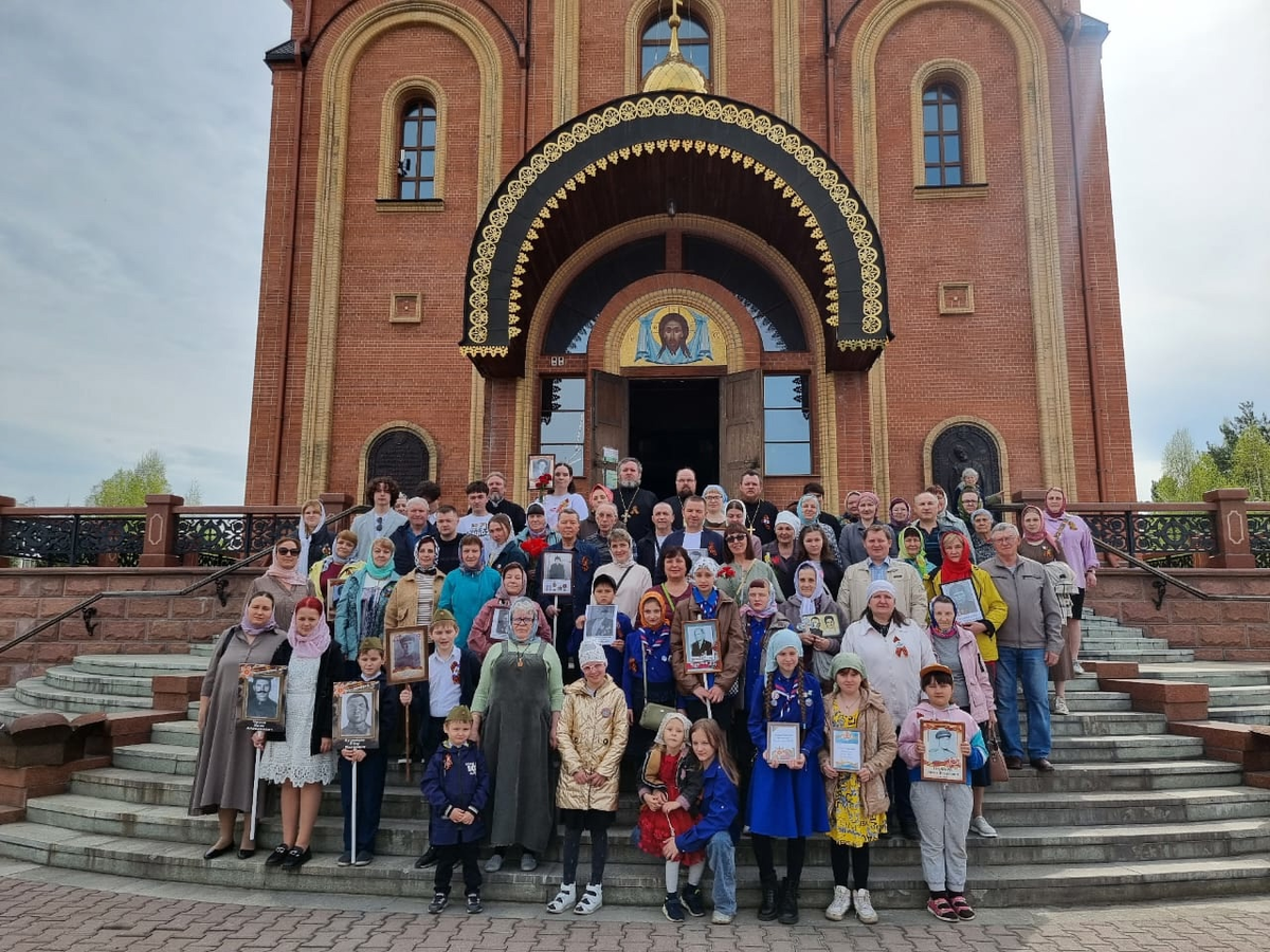 По окончании молебна священнослужители, прихожане и ребята из отряда Братства православных следопытов имени прмч. Льва (Егорова) приняли участие в шествии «Бессмертного полка» по центральной улице Победы до памятника Воину-победителю, где состоялась церемония возложения цветов. Память погибших воинов почтили минутой молчания.