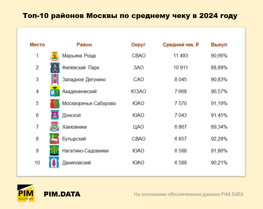 Сервис PIM.DATA, входящий в экосистему решений PIM Solutions, выяснил, жители каких районов Москвы делали заказы с наибольшим средним чеком в 2024 году. Для этого были проанализированы интернет-заказы более 3 млн человек, входящих в обезличенную выборку сервиса PIM.DATA в Москве, что составляет 33% от официального взрослого населения города. Адреса мест получения заказов были привязаны к конкретным районам с помощью Федеральной информационной адресной системы (ФИАС). Полностью исследование опубликовано на сайте PIM Solutions. Лидером стал район Марьина Роща со средним чеком 11 493 рубля. Второе место занял район Филёвский Парк с показателем 10 911 рублей. На третьем месте расположилось Западное Дегунино, в котором средний чек составил 8045 рублей. Столь высокие показатели Марьиной Рощи и Филёвского Парка связаны с тем, что жители этих районов предпочитают делать крупные заказы, состоящие из дорогих товаров. Район Западное Дегунино включает в себя большое количество многоэтажных новостр