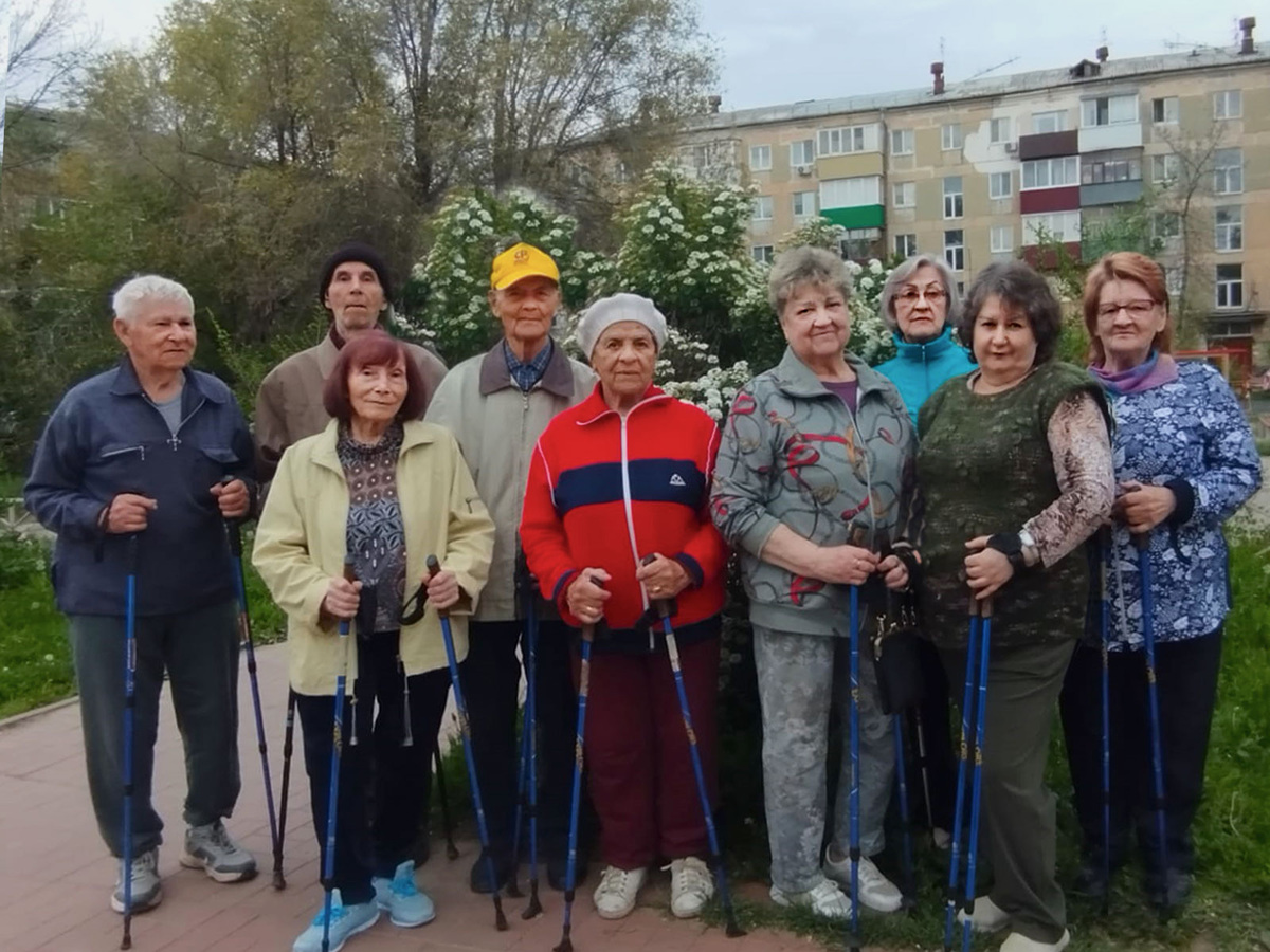 Группа здоровья "Оптимисты" Группа здоровья "Оптимисты" функционирует уже 5 лет, тренировки проводятся ежедневно 5 дней в неделю по одному часу в день. Занимаются люди возраста 56-92 года, кроме непогоды. Нагрузка на спортсменов щадящая с учётом возраста, но системные занятия дают результат налицо. За эти годы люди сдружились, кроме спорта занимаются флористикой, участвуют в мероприятиях по поддержке наших ребят в СВО, участвуют в культурно-познавательных мероприятиях. Своим упорством в спорте пропагандируют здоровый образ жизни. Некоторые люди хотя и в одиночку, но уже преодолели стеснение и выходят на прогулки с инвентарем. Качество жизни возрастных людей стало однозначно интереснее, активное. а это главное. PS; На фото часть группы, фото сделали спонтанно у красиво цветущего кустарника. Остальные члены группы шагали по другому маршруту.