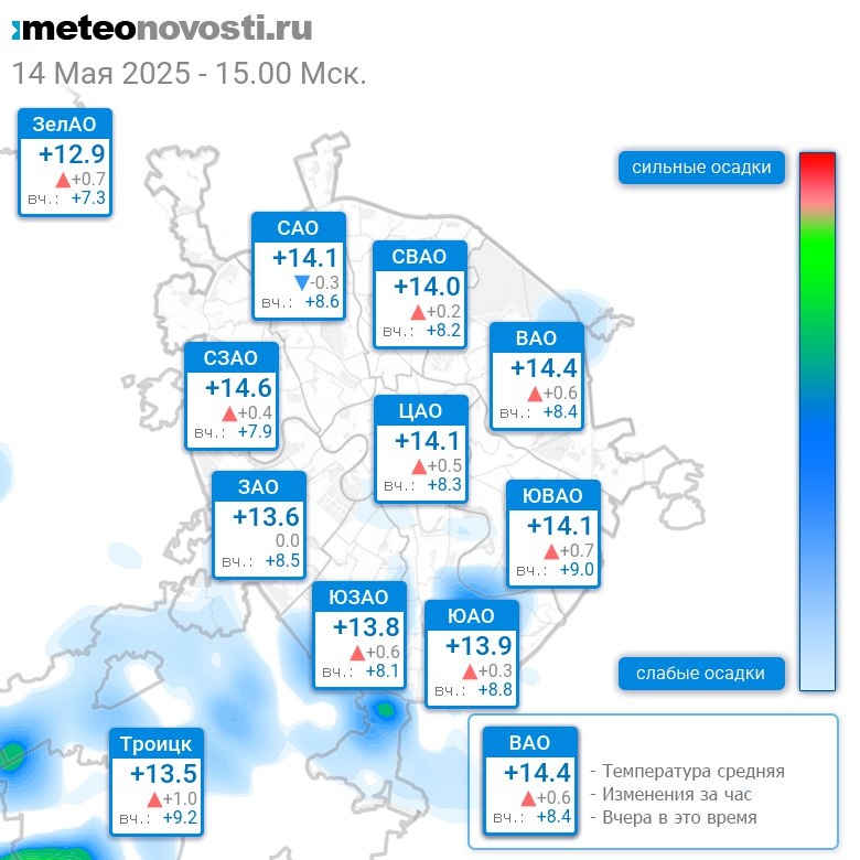 В 15:00 в Москве было от +12.5°C до +15.7°C, средняя температура +14°C #погода #Москва #весна #температура #14мая #среда Перейти на сайт Прогноз погоды на 14 дней