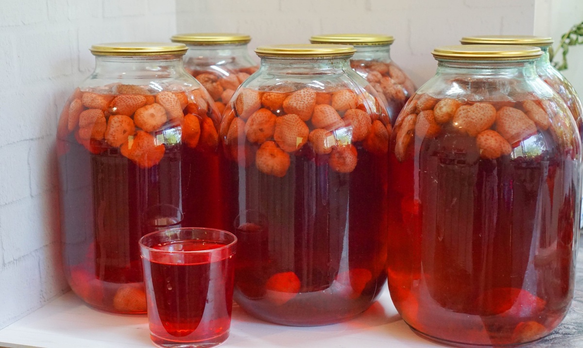 #### Ингредиенты: - **Свежая клубника** — 1 кг - **Сахар** — 600–700 г (регулируйте по вкусу) - **Вода чистая питьевая** — 2 литра - **Лимонная кислота** — щепотка (по желанию) --- #### Как правильно подготовить банки и крышки? Перед началом процесса стерилизуйте стеклянные банки и металлические крышки любым удобным способом: паром, кипятком или в духовке. Это обеспечит сохранность напитка. --- #### Процесс приготовления: 1. **Подготовка ягод:** Хорошо промойте клубнику прохладной проточной водой, удаляя плодоножки и мусор. Оставьте обсушиваться на бумажном полотенце. 2. **Наливаем воду и добавляем сахар:** В большой кастрюле доведите до кипения чистую воду. Постепенно всыпьте сахарный песок, постоянно помешивая, пока он полностью растворится. 3. **Закладка ягод:** Аккуратно положите очищенную клубнику в кипящий сироп, дождитесь повторного закипания. 4. **Доведение до готовности:** Проварите клубнику в течение 5–7 минут, периодически аккуратно встряхивая кастрюлю, чтобы равномерно расп
