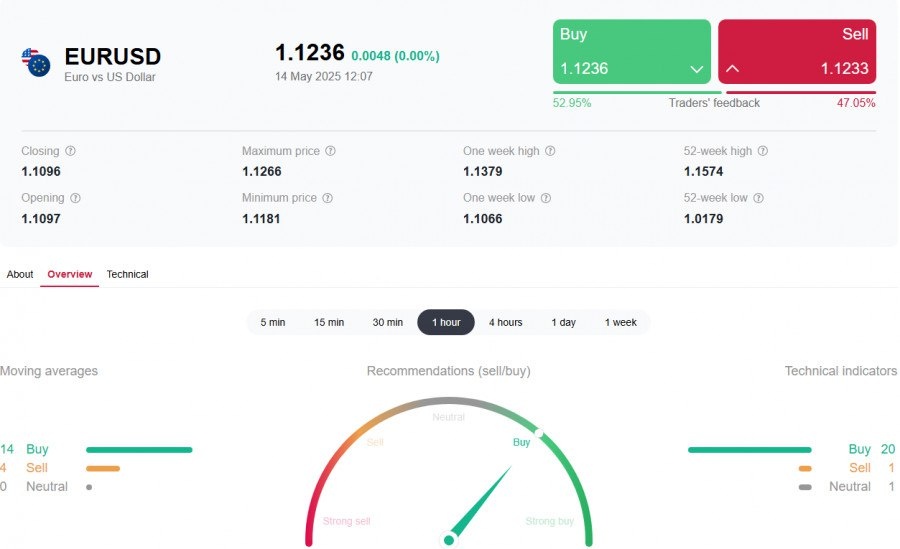 EUR/USD демонстрирует уверенный рост в среду, 14 мая 2025 года, на фоне резкой коррекции доллара США