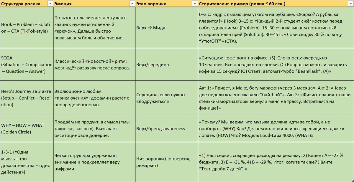 1. “Что если…” – сценарий 🎯Уровень воронки: Верхний 📍Активирует воображение, создаёт вовлечение через гипотезу: «А что, если это реально?» Что, если бы твой холодильник сам заказывал продукты? Или знал, когда ты в депрессии, и предлагал шоколад? 🍫 Умный холодильник уже в продаже: он не поспорит с тёщей, но вот список покупок — сделает идеально. 2. Hook – Problem – Relatability – Solution – CTA 🎯Уровень воронки: Верхний → Средний 📍Начинается с цепляющего хука, вызывает «узнавание» себя, даёт решение и призыв к действию. [Hook] «Ты тоже делаешь вид, что слушаешь на Zoom-е, но на самом деле скролишь новости в телеге?» [Problem] Постоянная усталость, расфокус, 5 кружек кофе… [Relatability] Мы тоже проходили это — каждый день как день сурка. [Solution] Мы перешли на тайм-менеджмент по методу “Помидорки” и сделали удобное приложение. [CTA] Скачай бесплатно — и пусть твой день будет полон энергией. 3. “Hero’s Journey” в миниатюре 🎯Уровень воронки: Средний 📍Вовлекает через сторителлинг