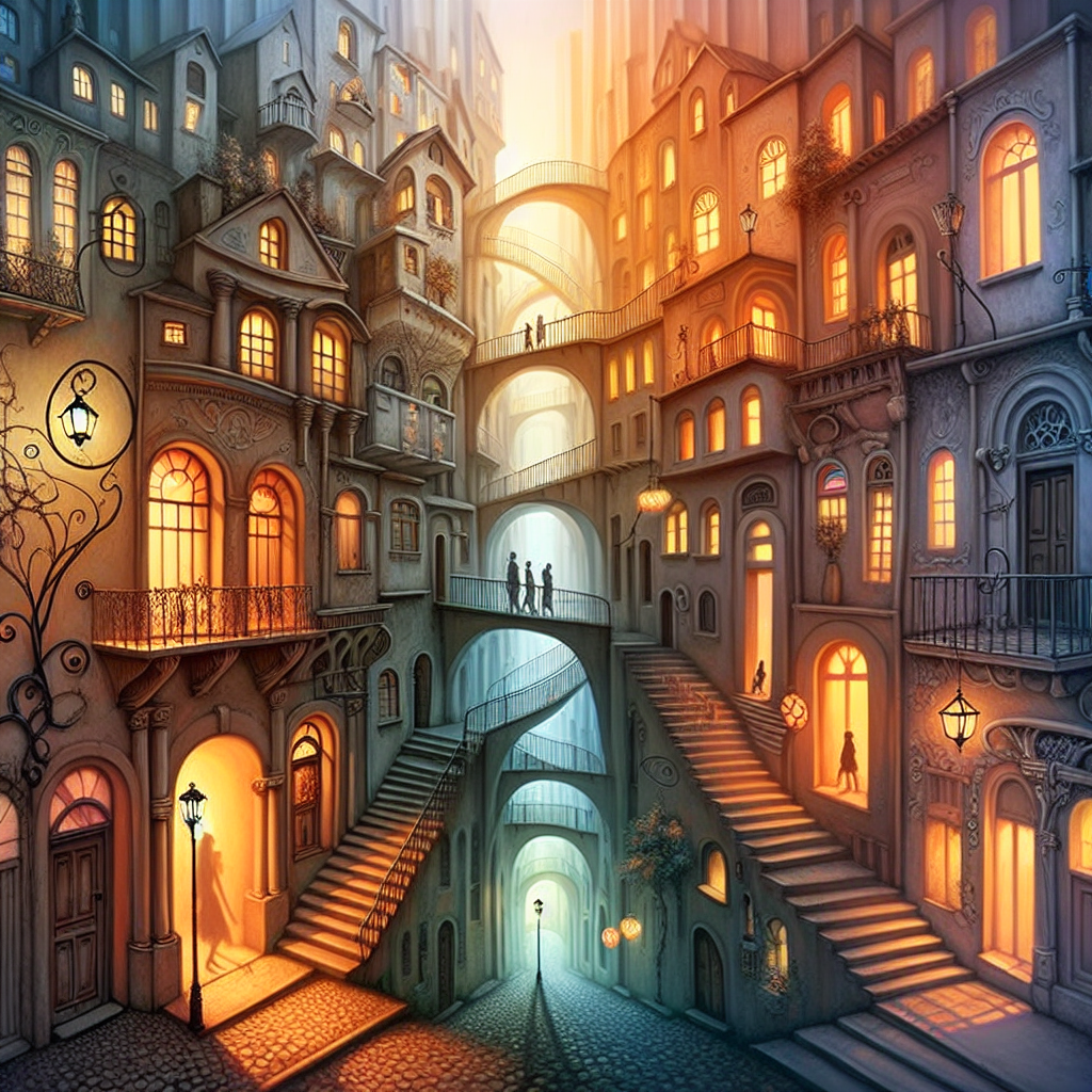 Этот город меняет облик в зависимости от того, кого ты видишь первым, входя в его ворота. Если увидел ребёнка — город наполнен играми, звуками, хрупкостью. Если старика — он густой, тёплый и другой. Если незнакомку в маске — начнётся карнавал теней. У каждой улицы здесь — своя роль: улица Сожаления шепчет невидимые имена, улица Восторга взлетает в небо и исчезает, улица Утра снует по кругу, идущая к одному рассвету. Твой маршрут сам выбирается городом — он знает, какую сторону тебя показать.