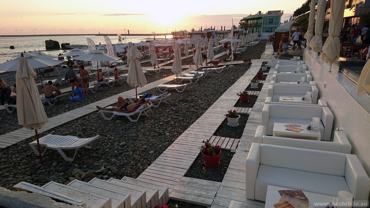 Огромный бесплатный городской Пляж Приморский Сочи находится в Центральном районе между частным пляжем санатория «Черноморье» и пляжем Мориса Тореза. Этот пляж – один из самых посещаемых в курортной столице России. Часть выделена для гостей отелей Меркури и Пульман. Будем условно называть ее пляжем Меркури. «Приморский» – галечно-каменистый пляж с крупной и средней галькой, перемежающейся песочными вкраплениями. Длина пляжа – более 700 м. Вход в море пологий и достаточно удобный. Конечно же, есть обязательные для пляжного сервиса кабинки для переодевания, медпункт, бесплатные душевые. Можно арендовать лежаки, шезлонги, зонты, надувные матрацы. В деревянных беседках работают пункты массажа и плетения косичек. Среди водных развлечений технической зоны – водные велосипеды, катания на катере, «банане», яхте. Стоимость аренды лежака под навесом или зонтом составляет 1000 рублей в день (можно приходить и возвращаться - выдаются браслеты). Кроме того, можно арендовать мини-бунгало (по почасов