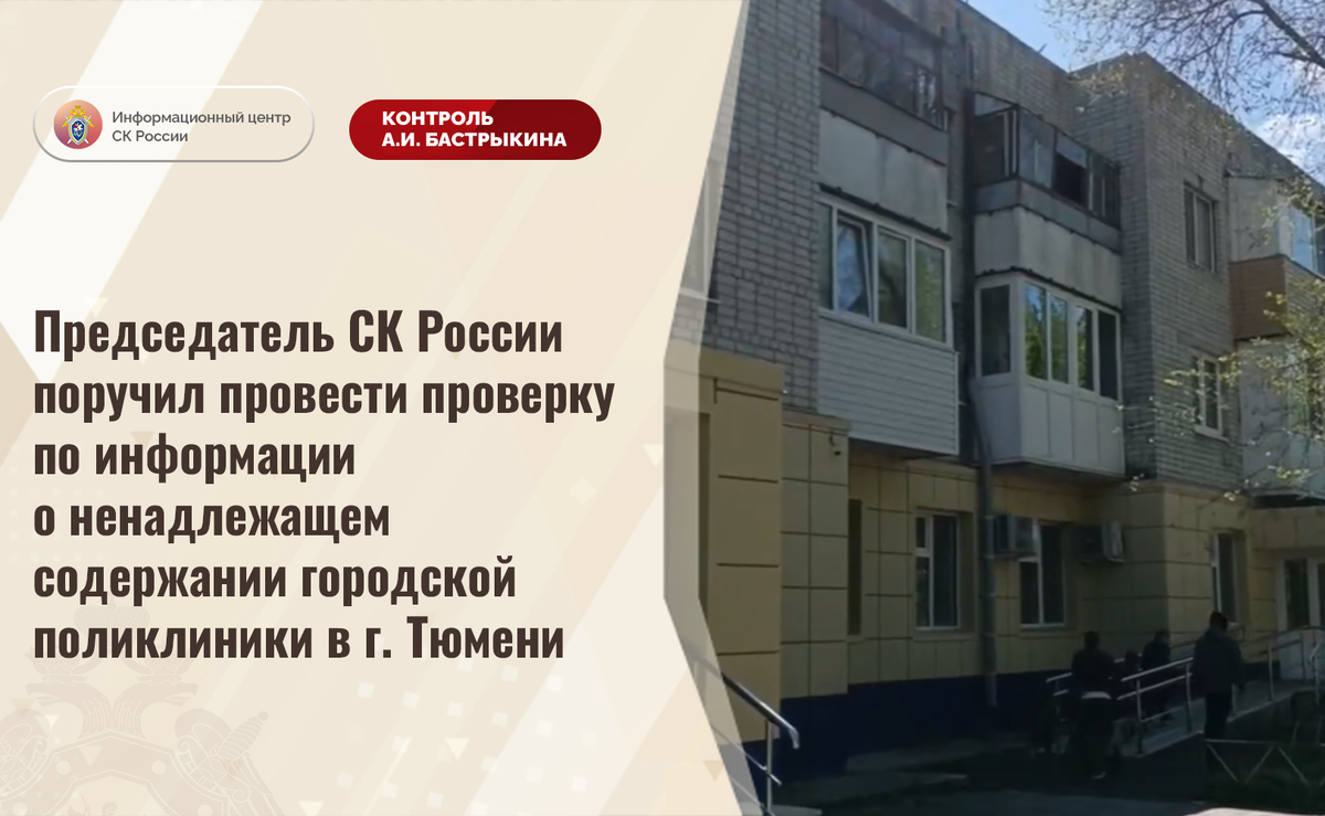 Председатель СК России поручил провести проверку по информации о ненадлежащем содержании городской поликлиники в г. Тюмени В социальной сети сообщается, что в городе Тюмени в здании городской поликлиники, 1971 года постройки, обрушается кирпичная кладка фасада, фрагменты которой осыпаются на пешеходную зону, что может привести к травмированию прохожих, в числе которых дети. Несмотря на жалобы граждан, меры к проведению ремонтных работ не принимаются. Председатель Следственного комитета Российской Федерации Александр Иванович Бастрыкин поручил руководителю СУ СК России по Тюменской области Александру Александровичу Кублякову провести процессуальную проверку и доложить об установленных в ходе первоначальных проверочных мероприятий обстоятельствах, а по завершении проверки – о ее результатах. Исполнение поручения, а также ход процессуальной проверки поставлены на контроль в центральном аппарате ведомства. #СледственныйКомитет #СКРоссии #СКР #ИЦСКР #ИнформационныйЦентр #АлександрБастрыкин
