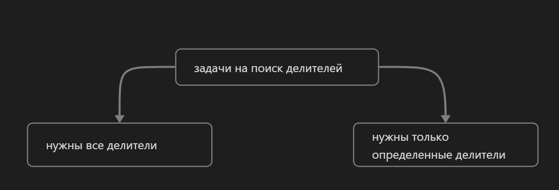 Задания могут быть 2 типов Разделения на два эти типа связаны с тем, что в первом случае придется перебирать все числа в поисках делителей, что очень долго. Во втором случае, перебор делителей можно сократить (по возможности, не всегда) и перебор пойдет быстрее. 🔴 Два вида решений: 1️⃣ с медленным перебором 2️⃣ с быстрым перебором (до корня квадратного) Все делители числа можно разделить на две половины (до корня и после) Найдя все делители с первой половины, можно найти сразу и делители со второй. Например: 3 - делитель числа, если 36 поделить на 3 - получится 12, делитель со второй половины. 🔴 Тип первый - нам нужны все делители ◾️ определяем диапазон чисел, который надо перебрать ◾️ определяем, можно ли в качестве делителей рассматривать 1 и само число ◾️ определяем, какое условие для отбора чисел В этом случае сто процентов лучше использовать быстрый способ перебора (хотя можно и медленный, но возможно придется очень долго ждать результатов)