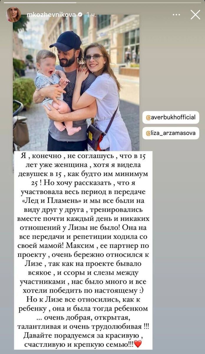 Мария Кожевникова поддержала Илью Авербуха, который спровоцировал скандал своими словами о том, что в 15 лет Лиза Арзамасова «была уже женщиной». Актриса участвовала в ледовом шоу, тренировалась с Лизой и может подтвердить, что на тот момент у неё с Авербухом отношений не было. При этом Мария утверждает, что к 15-летней Лизе все относились именно как к ребенку. «Она на все передачи и репетиции ходила со своей мамой! Максим, ее партнер по проекту, очень бережно относился к Лизе, так как на проекте бывало всякое: и ссоры, и слезы между участниками, нас было много, и все хотели победить по-настоящему. Но к Лизе все относились как к ребенку, она и была тогда ребенком… очень добрая, открытая, талантливая и очень трудолюбивая! Давайте порадуемся за красивую, счастливую и крепкую семью!» - заявила она. Блокнот Старс 👨🏻🔧Работа 🚘 Авто 🏕️Глэмпинг