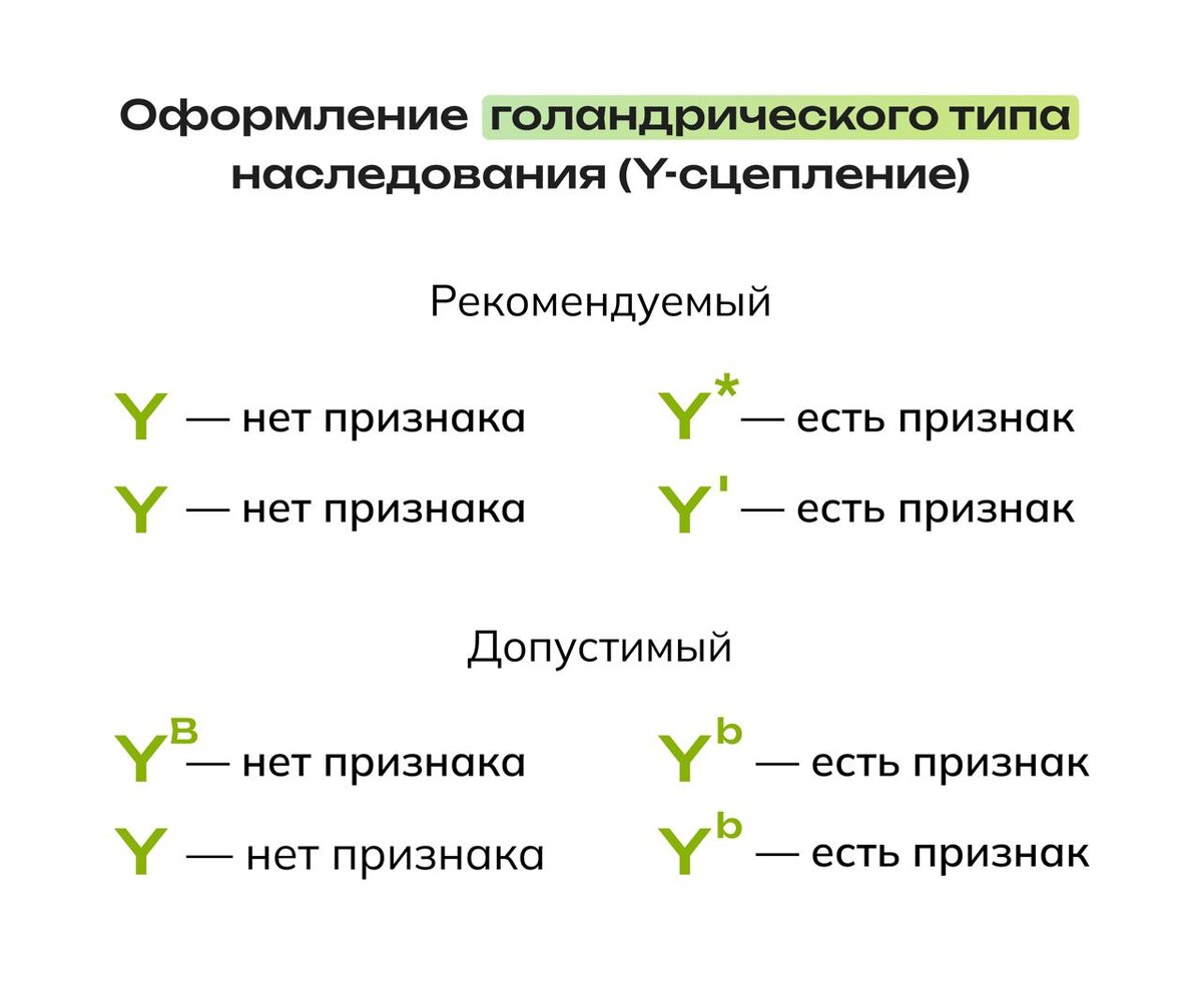Правила оформления задач на голандрический тип наследования 🔥 Бобряшова И.А. (глава экспертов ЕГЭ) в этом году провела вебинары, на которых были озвучены рекомендации по оформлению задач на голандрический тип (Y-сцепление) Рекомендовано использовать запись Y* или Y' для обозначения присутствия признака (болезни), а «пустую» Y — для обозначения отсутствия признака (болезни) Обосновывают это так: «признак на Y-хромосоме не имеет аллеля, он либо есть, либо нет». При этом это всего лишь рекомендации, а не обязательные требования. Вполне допустимо использование стандартных YB — нет признака, Yb – есть признак (и наоборот), также можно использовать Yb как обозначение признака, а пустую Y — как его отсутствие. В общем, вариантов масса (картинка в тему) Не пугаемся и не стрессуем. Это попытка избавиться от непоняток, ведь уже второй год ФИПИ заваливают вопросами — а как «правильно» оформлять эти задачки. Ну, теперь мы знаем 🌹
