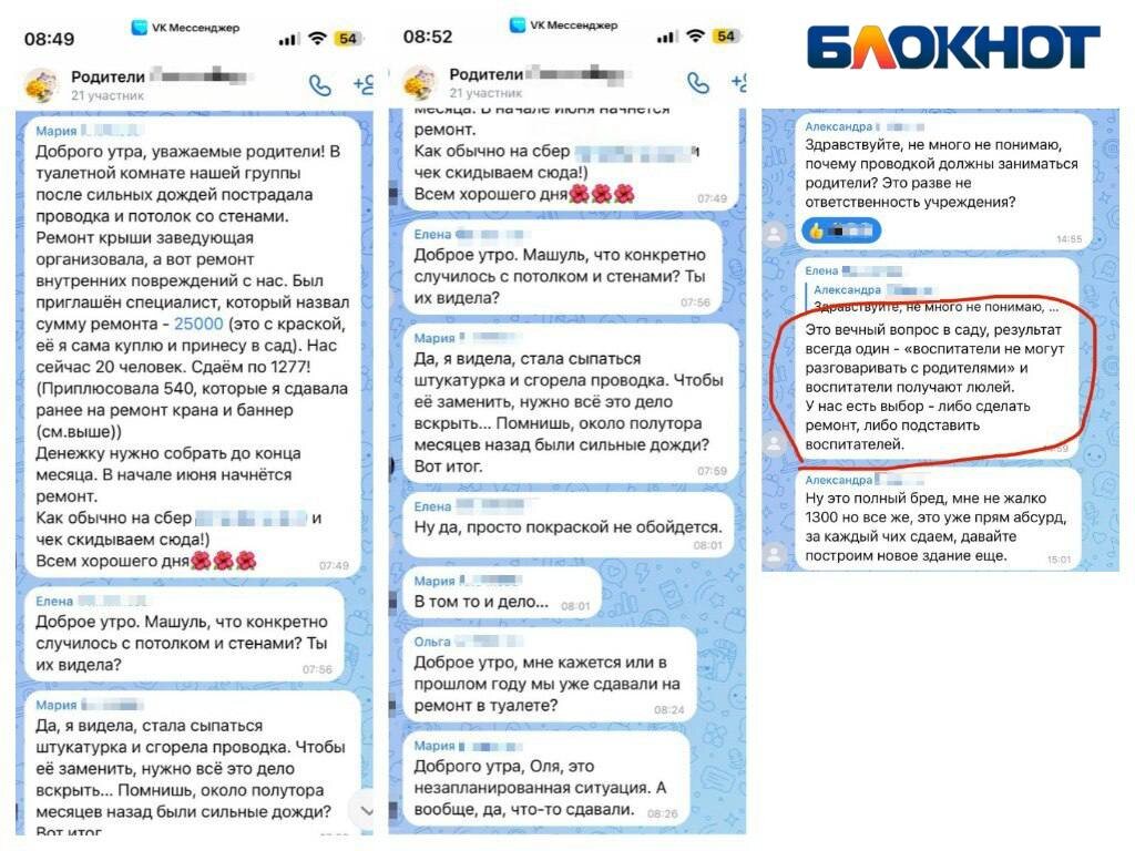 Родители воспитанников детского сада №331 в Тракторозаводском районе Волгограда пожаловались на бесконечные поборы на нужды учреждения. В редакцию «Блокнота» анонимно обратились обеспокоенная жительница. По ее словам, поборы сверх установленной родительской платы, которая, к слову, тоже не мизерная, стали для их дошкольного учреждения привычным делом. — Все боятся говорить об этом. Но эти суммы уже выходят за все разумные пределы. В группе 25-30 детей. Каждый из родителей приносит обязательно туалетную бумагу, бытовую химию, тряпки, мыло и так далее. Список нам предоставляют. И постоянно: то кран в группе сломается, все за счет родителей, теперь крыша потекла и ремонт санузла в группе за счет родителей! Неужели это не должно оплачиваться государством? Плата за сад постоянная 3500, плюс 2500 рублей дополнительные занятия. И поборы тысячи на 3000 каждый месяц (праздники, дни рождения сотрудников, ремонты детских площадок, установка четвертого домофона на одну и ту же дверь, калитка в сад