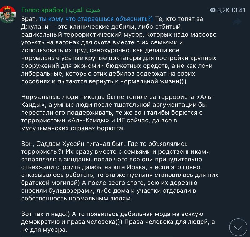 Есть такой любопытный канал — «Голос арабов». Ведёт его некий русскоязычный иракец из России, судя по всему, сын беглого функционера времён Саддама. На канале действительно встречаются интересные исторические обзоры, но в целом контент предсказуем: панарабисты — герои, монархии — продались дьяволу, а Израиль — сплошной геноцид и ужас-ужас.