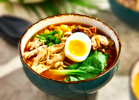 3. Сборка: В глубокие пиалы выкладываю лапшу, нарезанную курицу, шпинат (он сварятся в горячем бульоне). Заливаю кипящим бульоном, сверху – яйцо. Посыпаю кунжу