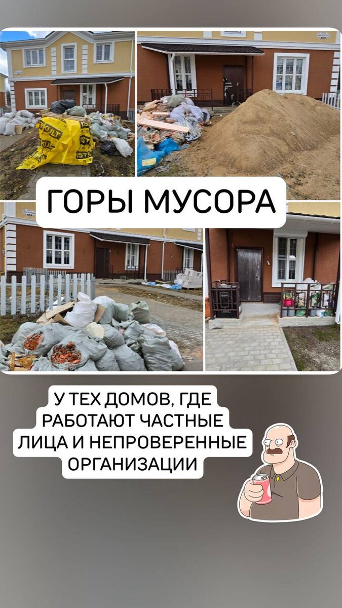 Итоги прогулки таковы, что у тех домов, где работают частные лица и непроверенные организации - горы мусора, вся придомовая территория изрыта и испорчена строительными отходами и остатками материалов для отделки, фасады домов поцарапаны и отбиты😣🫣 Но наши объекты вы можете легко узнать по чистоте и порядку на территории дома, по укрытой входной зоне и, конечно, приметной табличке😉 На ней указаны наши контакты, по которым вы всегда можете с нами связаться, а также есть QR-код на соцсети, чтобы посмотреть актуальные новости 📰