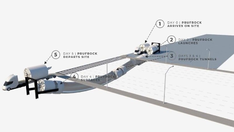 Prufrock 5 представляет собой робота для непрерывного строительства тоннелей. Машина стартует прямо с поверхности, роет под землей, а затем снова появляется на поверхности.