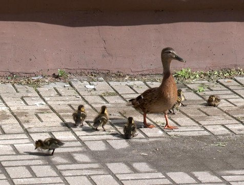 В центре Калуги заметили необычных прохожих. Утка и семь ее малышей сейчас гуляют по улице Ленина. С интересом к семейству отнеслись калужане: они останавливались и даже выходили из близлежащих зданий, чтобы понаблюдать за пернатыми, которых такое внимание нисколько не пугало.