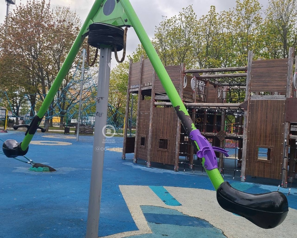 "На неделю закрывали детскую площадку у Администрации, так как чинили существенные поломки. Качели на фото взлетают с человеком метра на 3. Резина изорвана в двух местах почти на половину. То есть ещё пару дней и они отлетят...".