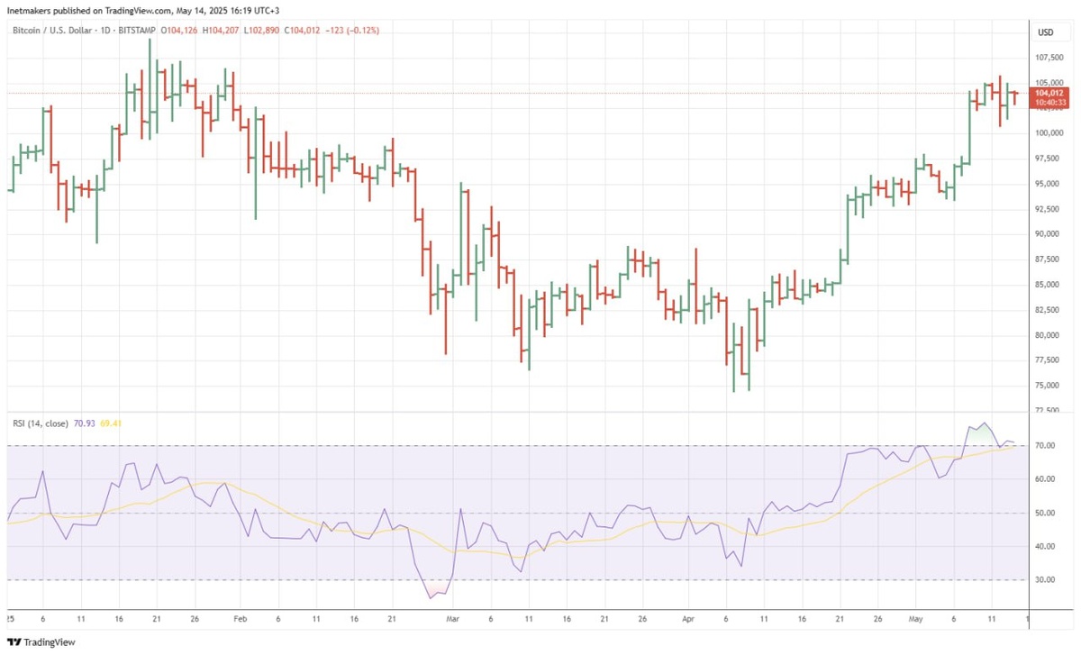 Технический анализ Биткойна на 14 мая 2025 Криптовалюта достигла максимума по RSI уже сильно перейдя в уровень перекупленности, это может говорить о том, что покупает какой-то крупный инвестор.