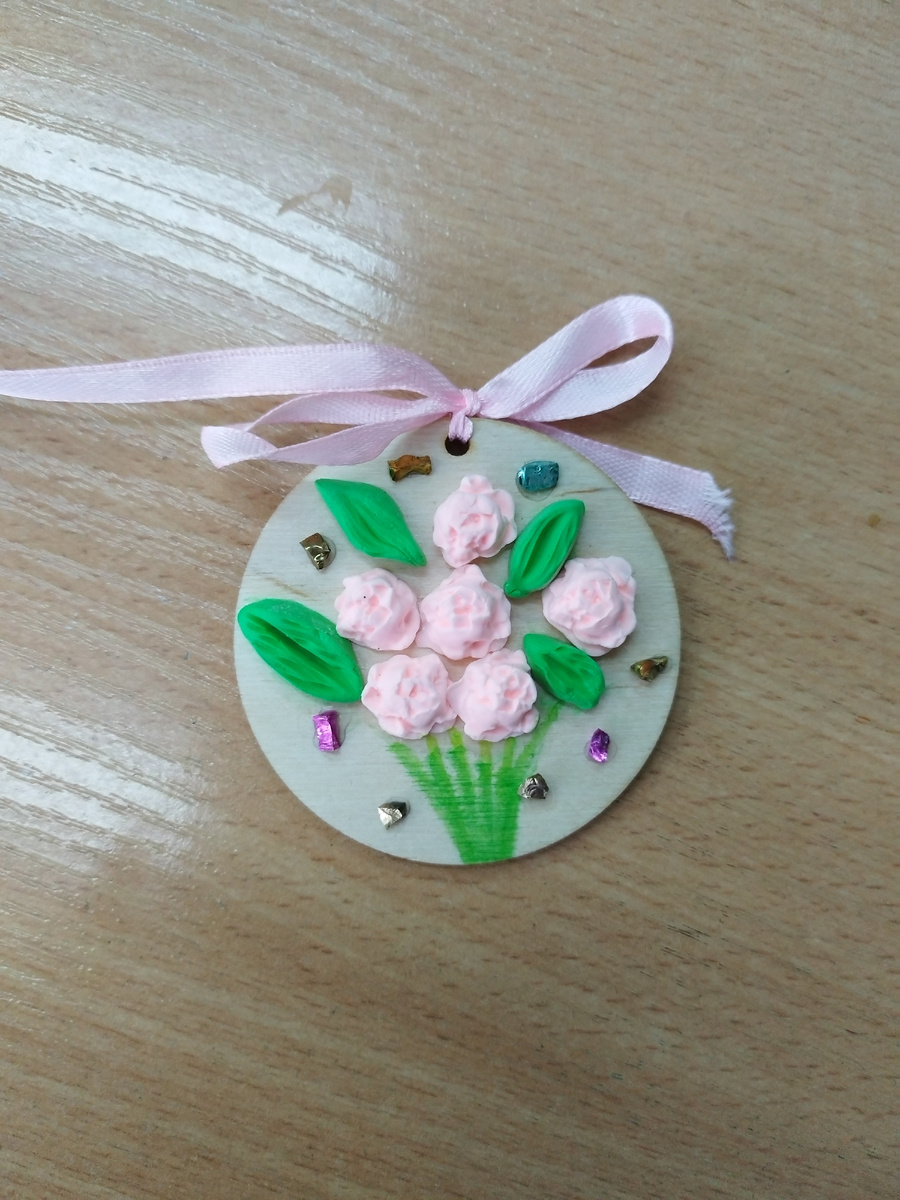 Это простая поделка для деток , причём разного возраста , да и взрослых тоже. Даже маленькие дети легко справляются с задачей. Для работы , опять же , понадобится молд , а ещё воздушный пластилин двух цветов. Цвет для розочек можно выбрать любой , какой понравится , а для листиков зелёный. Пластилин нужно пожмякать ( как дети говорят) в руках , пока он слегка не подсохнет , если заталкивать в молд кусочки пластилина сразу , то придётся долго ждать полной просушки , а слегка подсушенный пластилин можно сразу и достать , тогда розочки быстро подсохнут на открытом воздухе и сразу можно делать следующие. Для листочков тоже нужен молд , но если его у вас нет , то можно и ручками вылепить листочки , они делаются не сложно . С помощью стека продавить линии на листиках. Я заготавливаю сразу много листочков и розочек когда готовлюсь идти на мастер-класс. Цвет розочек у меня разный. На ВБ беру заготовки для магнитиков 6см. в диаметре. С помощью клея ПВА нужно приклеить розочки и листики , стеб
