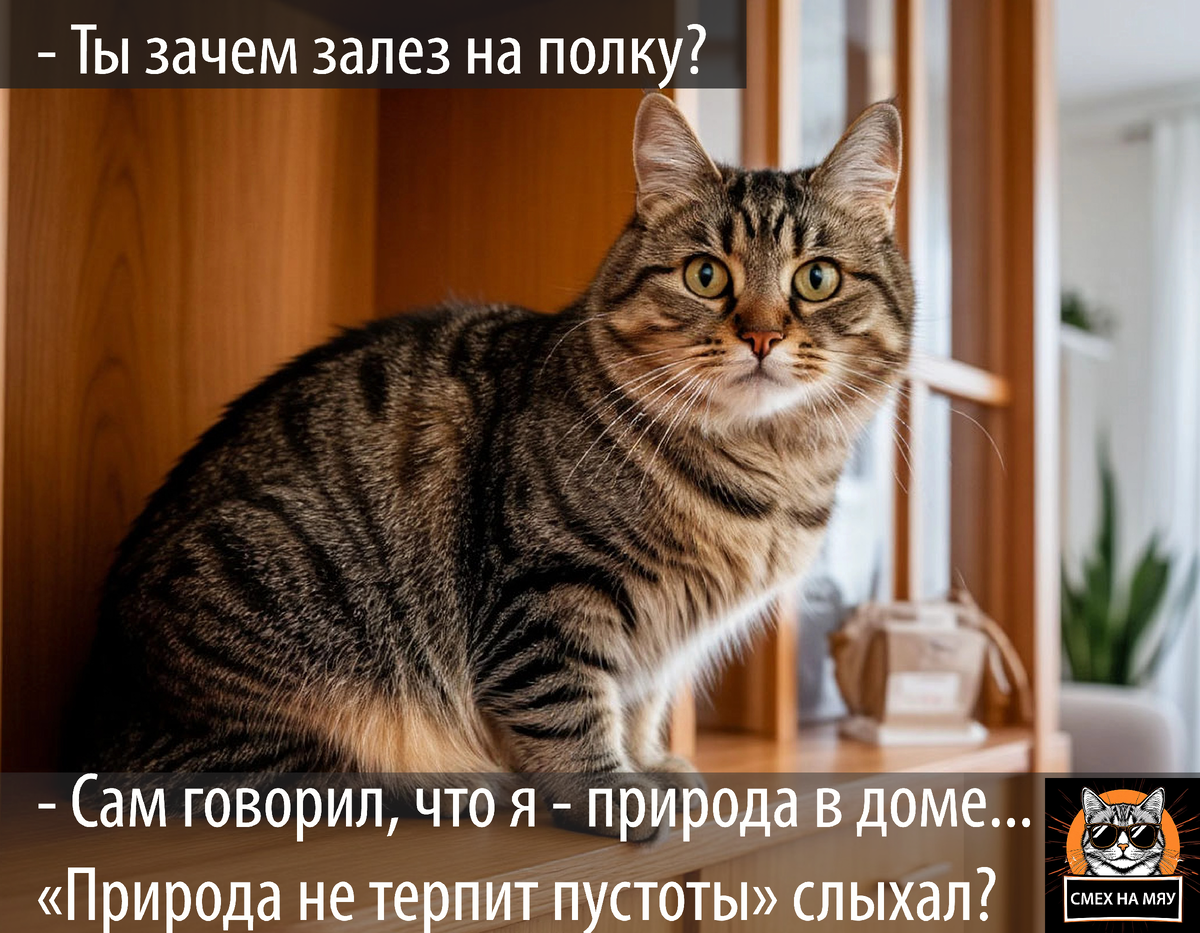 Существует «закон притяжения котов»: любое свободное пространство притягивает кота так же, как магнит манит железные детали. Коты просто обожают находить тепло, и любое свободное место — это скорее всего горячая точка: батарея, стиральная машина, трубы отопления, тёплое одеяло, подушка и др. В каждом новом месте котик проводит испытание на прочность: «А выдержит ли этот столик или полка мою величественную лапу?» Коты считают, что они короли и королевы. Поэтому любой предмет мебели является потенциальным троном для наслаждения! Часто они запрыгивают как можно выше, чтобы наблюдать за всем происходящим с высока. Котам нравится прятаться в неожиданных местах, чтобы "поджидать" своих жертв, например, ваши ноги в прикольно цепляющихся за коготки носках. Котикам нужно идеальное место идеальной для засады! У ваших котов есть инстинкт подмечать уютные места для отдыха. И чем больше хлама вокруг, тем лучше их "гнездо"! Коты всегда ищут наилучший маршрут для передвижения, и занимая место, они п