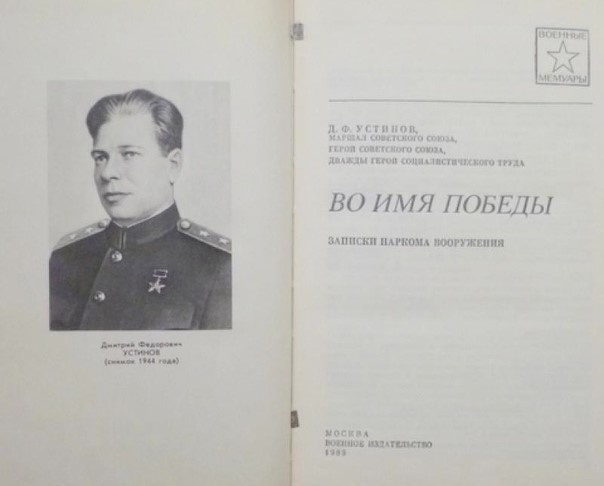 Дмитрий Устинов «Во имя Победы. Записки наркома вооружения» Маршал Дмитрий Устинов, Министр обороны СССР с 29 апреля 1976 года по 20 декабря 1984 года, всю Великую Отечественную войну возглавлял Народный комиссариат вооружения СССР. Именно под руководством Дмитрия Федоровича была проведена эвакуация промышленных предприятий на восток страны и организована работа всего военно-промышленного комплекса. В книге Дмитрий Устинов коротко касается своей жизни до Великой Отечественной войны, а затем подробно описывает военные годы. Читая книгу, понимаешь, что слова «Все для фронта, все для Победы» — не просто лозунг, и труженики тыла внесли огромный вклад в разгром врага. Здесь нет рассказов о военных операциях, окружениях, взятых в плен и уничтоженных дивизиях врага. Но все это было бы невозможно без качественного и современного (на то время) оружия. А как его сделать в условиях, когда запад страны захвачен врагом, нарушены логистические связи, не хватает сырья и рабочих рук? Только безмерным