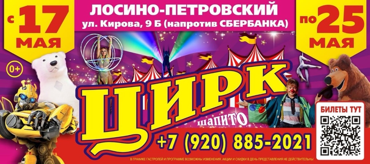 Приглашаем вас в Цирк шапито «Премьера» в Лосино-Петровском! 💫Яркое, невероятное, динамичное, экстремальное цирковое представление, покорившее сердца многих зрителей разных городов и заставившее их поверить в невозможное 🪄 🎁 Акция! Все билеты на шоу 17 мая по 1000 рублей. Акция действует при покупке билетов до 16 мая. График, билеты онлайн http://circus.premiera.ticketscloud.org/
