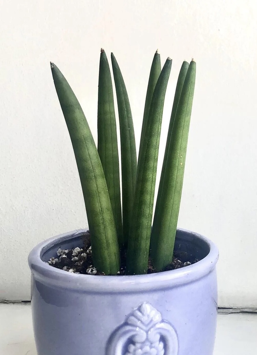 ☀️ Освещение: Лучше всего яркий рассеянный свет, но переносит и полутень. 💧 Полив: Умеренный, только после полного просыхания грунта. Зимой – реже. 🌱 Почва: Легкая, хорошо дренированная (подойдет смесь для кактусов и суккулентов). 🌡️ Температура: Оптимально +18–25°C, зимой не ниже +12°C. 💦 Влажность: Не требовательна, хорошо переносит сухой воздух. 💊 Подкормки: Летом 1 раз в месяц удобрением для суккулентов (половинная доза). Важно! Сансевиерия Микадо (Sansevieria Mikado) – не самый быстрорастущий сорт. Если растение выглядит здоровым (листья твердые, нет пятен), просто наберитесь терпения. Форма и структура: - Листья цилиндрические или слегка уплощенные, похожие на толстые трубочки. - Кончики – острые, иногда с небольшим сухим шипом. - Поверхность – гладкая, жесткая, с легкими продольными бороздками. Направление роста: - Молодые листья растут вертикально вверх, затем могут слегка отклоняться в стороны. - У взрослых растений ли