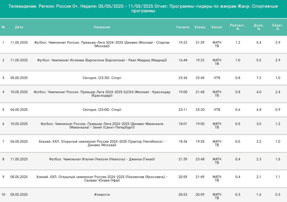 «ЧТО ПО ТЕЛИКУ»? Итоги спортивного смотрения (05.05-11.05, Россия, 18-54) 🗣 Удачная неделя для "Матч ТВ": сразу 3 высоких результата; 🗣 Дерби "Динамо" - "Спартак" повторяет второй самый высокий рейтинг сезона. Теперь все 7(!) наиболее смотрибельных российских футбольных трансляций - игры с участием "Спартака"; 🗣"Эль-Класико" показывает свой привычный 1 балл рейтинга (уже в 3-й раз за сезон), так и не дотянув до Топ-5, который полностью занят матчами "Спартака"; 🗣 Хороший результат у ЦСКА - "Краснодар". Игра "Зенита" особого интереса не вызвала; 🗣 Эта неделя - кубковая. А мы помним, что Кубок уже традиционно смотрят лучше РПЛ, и ждём высоких цифр. "Спартак" - "Ростов" покажут в четверг в 20:00. А в воскресенье в 13:30 смотрим и игру красно-белых в Самаре в чемпионате. Топ 24/25: 1.4 - ❤️:❤️ | ⚽️ 1.2 - ❤️:❤️ | ⚽️ 1.2 - ❤️:❤️ | ⚽️ 1.2 - ❤️:❤️ | ⚽️ 1.1 - ❤️:❤️ | ⚽️ - 1.0 - 🟡:🟣 | 🇪🇸 Ч 1.0 - Дацик - Гаверн | 🥊 1.0 - 🟡:🟣 | 🇪🇸 СК 1.0 - ❤️:❤️ | ⚽️ 1.0 - ❤️:❤️ | ⚽️ 1.0 - 🟣:?