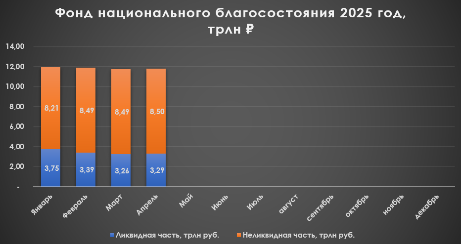 Минфин РФ опубликовал результаты размещения средств ФНБ за апрель 2025 г. По состоянию на 1 мая 2025 г. объём ФНБ составил 11,79₽ трлн или 5,5% ВВП (в марте — 11,75₽ трлн). Объём ликвидных активов фонда (средства на банковских счетах в Банке России) составил 3,29₽ трлн или 1,5% ВВП (в марте — 3,26₽ трлн). Министерство существенно сократило инвестиции в этом месяце — 2,3₽ млрд (в марте — 51,6₽ млрд), видимо, продажи из ликвидной части валюты/золота для восполнения дефицита бюджета заставили пересмотреть инвестиционную деятельность. IMOEX в апреле незначительно снизился по сравнению с мартом, но неликвидная часть подросла на 10₽ млрд (спасибо дивидендному сюрпризу от ВТБ), ликвидная часть тоже показала прибавку в 30₽ млрд из-за подорожания золота. 📈 Неликвидная часть активов ФНБ: ▪️ на депозитах в ВЭБ.РФ — 1057,6₽ млрд (в марте — 1055,9₽ млрд); ▪️ евробонды Украины — $3 млрд (прощаемся); ▪️ облигации российских эмитентов — 1,769₽ трлн (в марте — 1,77₽ трлн), 1,87$ млрд и 10¥ млрд; ▪️ пр