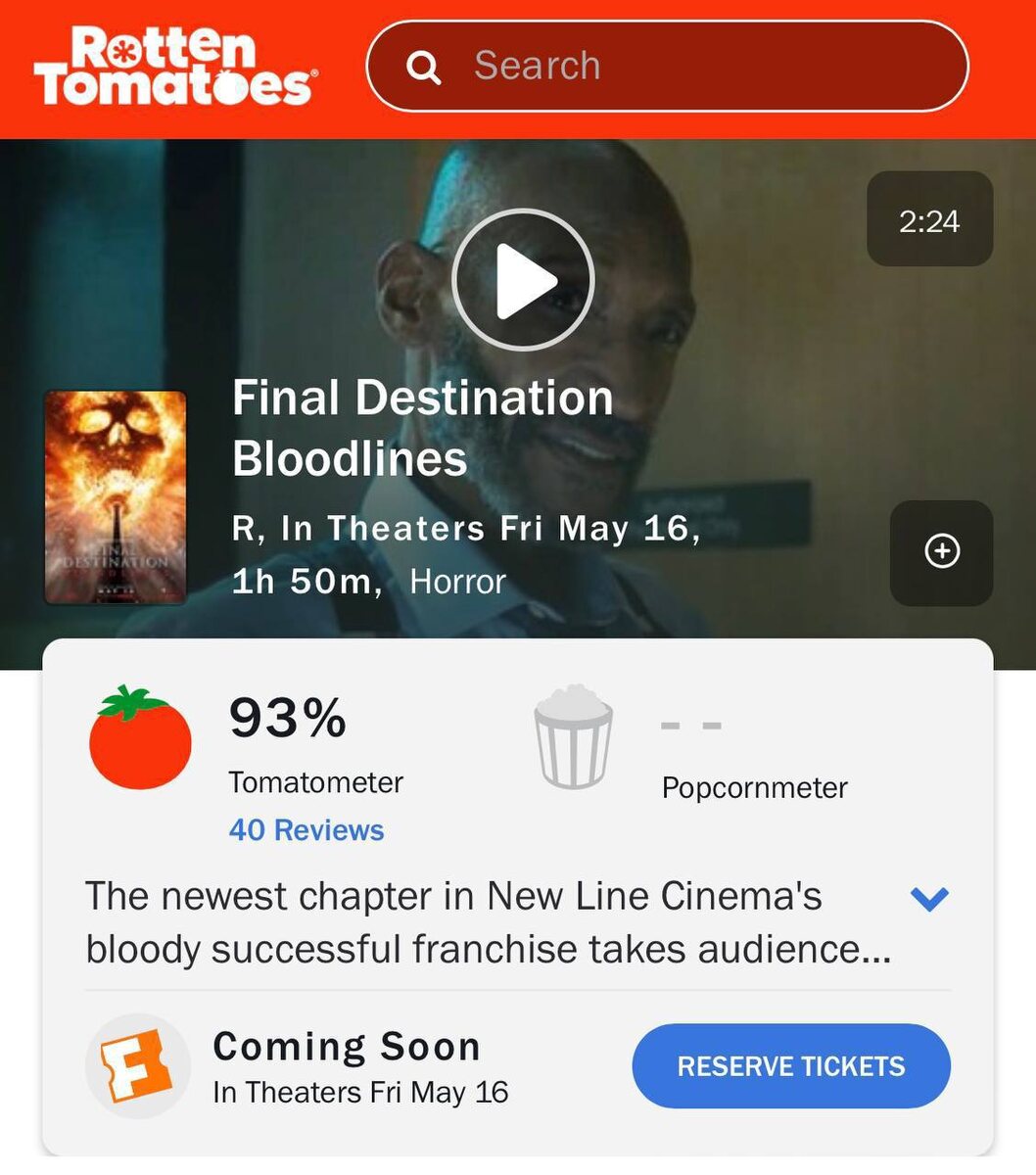 «Пункт назначения 6» внезапно выжил — 93% на Rotten Tomatoes. Для хоррора это как воскреснуть после падения с высотки. Для сравнения, прежние части: • Часть 1 — 40% • Часть 2 — 52% • Часть 3 — 44% • Часть 4 — 28% (да, было больно) • Часть 5 — 63% Критики в восторге: мясо, страхи и чёрный юмор — всё как мы любим. 16 мая смерть снова по графику. Развлекайтесь.