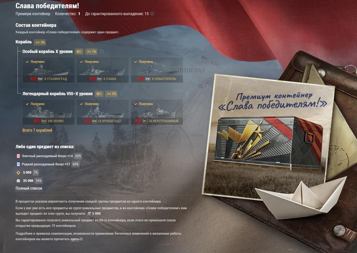 Контейнеры «Слава победителям!» Проверил удачу в праздничной лотерее… и, хоть с задержкой, доложу официально: Из гарантированного 20-го контейнера мне выпал Севастополь. (как единственный корабль которого у меня не было) Считаю — не худший вариант. Буду изучать, что умеет в боях. 💸 Всего ушло 50 000 дублонов. Да, больно (учитывая что выпал корабль за 60000 ОИ). Но любопытство — штука неуправляемая. 📦 В контейнерах кстати много редких экземпляров советской техники: - Топовые "десятки", как Сталинград, Слава, Москва, Смоленск, - Наградные и выведенные Кутузов, Ленин, Кронштадт, Хабаровск 💬 А ты уже открывал «Славу победителям»? Что выпало? Или держишь дублоны при себе? 🗳 Голосуем 👇 🔥 Выбил топ, доволен 🤯 Выпало что-то непонятное 👎 Потратил — и жалею 🤬 Не открывал, и не планирую