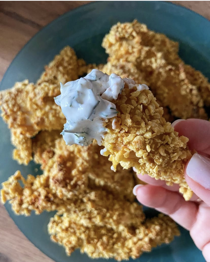 Куриные наггетсы: филе куриное примерно 800г яйцо куриное 2 шт. молоко коровье 60 мл мука пшеничная примерно 5 ст.ложек кукурузные хлопья без сахара примерно 300 г специи по вкусу (у меня соль, копченая паприка, смесь специй готовая таджикская) Соус: сметана 20% жирности 150 г корнишон 3 шт. чеснок 1 зубчик соль по вкусу майонез 1 ч.л. укроп небольшой пучок Приготовление: