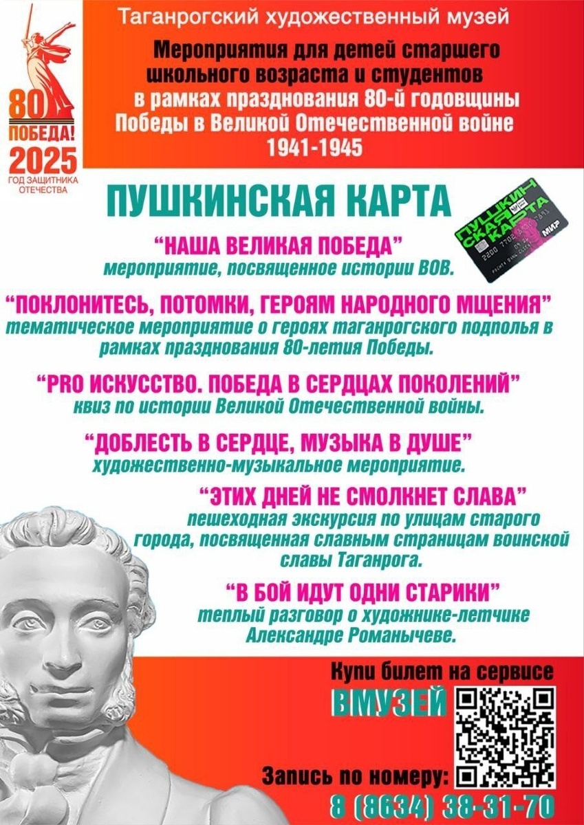 С Пушкинской картой в музей! Специальный проект «Пушкинская карта» позволяет молодым людям от 14 до 22 лет посещать музеи, театры, филармонии и другие культурные мероприятия бесплатно. Мы всегда рады нашим юным посетителям, для которых проводим познавательные экскурсии, увлекательные квесты, мастер-классы и разнообразные мероприятия! Не упустите эту уникальную возможность ! Ждем вас по адресу: ул. Александровская, 56 тел. 38-31-70