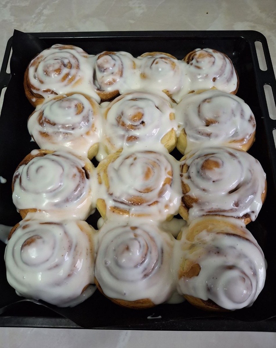Синнабоны получились потрясающие. Они очень мягкие, пышные, аппетитные. Крем тоже очень вкусный. Нежный, легкий, в меру сладкий, такой крем отлично дополняет вкус булочек. Ингредиенты: Для теста: Тёплое молоко - 250 гр. Дрожжи - 2,5 ч.л. (8 гр.) Сахар - 70 гр. Яйца - 2 шт. Сливочное масло - 80 гр. Соль - 1 ч.л. Мука - 520-600 гр. Начинка: Сливочное масло - 60 гр. Сахар - 1 стакан Корица - 3 ст.л. Крем: Сметана Сахарная пудра Приготовление: 1. Смешайте тёплое молоко, дрожжи и сахар. Оставьте на 5-10 мин. Добавьте яйца, масло, соль, ванилин и муку. Замесите мягкое тесто. Оставьте на 1 ч., каждые 20 мин. мешая тесто. 2. Раскатайте тесто, смажьте маслом, посыпьте сахаром и корицей. Сверните рулет, нарежьте на кусочки. 3. Выложите булочки на противень, дайте подойти 30 мин. Выпекайте при 180 гр. 20-25 мин. Перемешайте сметану и сахарную пудру. Смажьте горячие булочки кремом. Сметаны 200 гр.и 100 гр.сах.пудры .