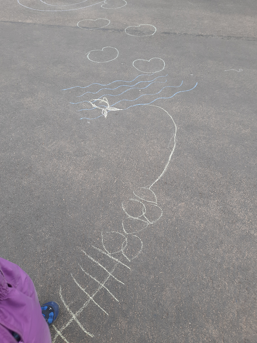 В моем детстве точно не было этой игры.И почему я сама не догадалась о таком замечательном способе занять ребенка на улице,когда все площадки уже надоели? Мы с дочкой назвали эту игру "полосой препятствий". А подсмотрели её,гуляя у нас в районе.Сегодня я её нашла в старом садике,нарисованную краской на асфальте. Суть проста: мелом рисуются задания. Например,нужно пропрыгать классики, покрутиться на месте, полопать пузыри, попрыгать с кувшинки на кувшинку и т.д. Мы взяли эту идею на вооружение и придумали целую историю.Заодно я ненавязчиво провела урок рисования на асфальте. Заметила,что дочь зациклина на рисовании " человеков". Остальное рисовать отказывается.захотелось мне её подтолкнуть. Начало придумала и самостоятельно нарисовала дочь. В процессе игры к нам присоединилась девочка постарше.Ей было не менее интересно,чем моей дочери. Занимались мы около часа.Умазались мелом с ног до головы и счастливые пошли в магазин. А задания можно придумывать разные, на что хватит фантазии