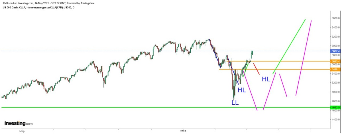 🍀 Всем добрый день и позитивного настроения! Наш крайний обзор по S&P500 был 23 апреля, и мы работали все что там было написано. Работали очень успешно и по факту радостно Что мы видим сейчас ❔ Вначале надо сказать, что первый график - это график прошлого обзора и как видим цена пошла вверх даже слегка перевыполнив наш план По ходу движения мы просто подождали рынок повыше - видели его силу Второй график - это по сути аналог первого, только переделанный под текущую ситуацию Вариант развития снова глубокой коррекции по сиреневым линиям, мы оцениваем не более 25➗ А вот то, что надо установить новый уровень HL (более высокого минимума) - это факт! И вообще рынку неплохо начать нудный распил в диапазоне 5931-5431(5361) Это движение можно формировать в виде треугольника и растянуть не на один месяц, жестко имея в обе стороны народ Потом сделать ложный прокол созданного диапазона - вниз и в итоге выйти вверх По сути фигура "перевернутая голова и плечи" уже существует Смысла ее расширять до