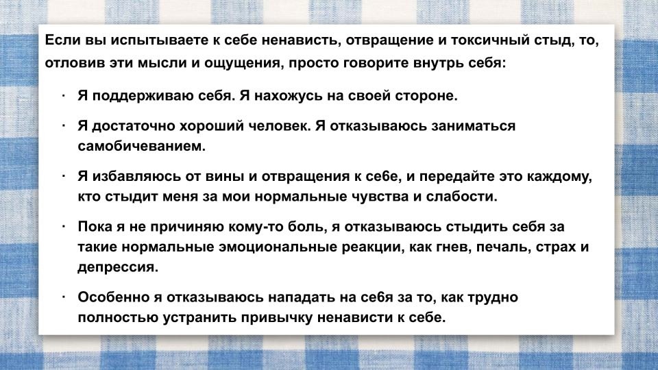 Например, если вы испытываете к себе ненависть, отвращение к себе и токсичный стыд, то, отловив эти мысли и ощущения, просто говорим внутрь себя: